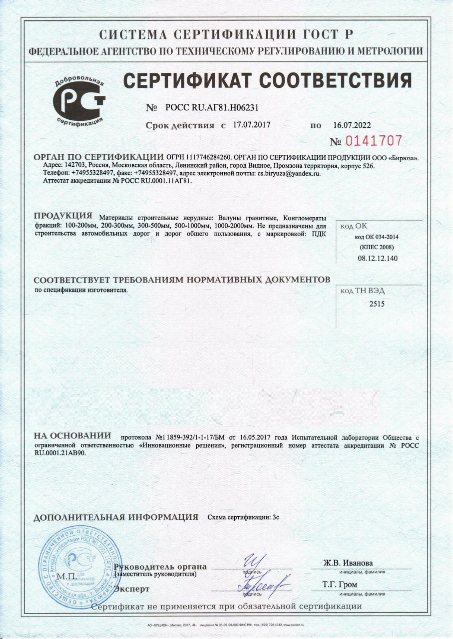 Сертификат соответствия на валуны и скальник